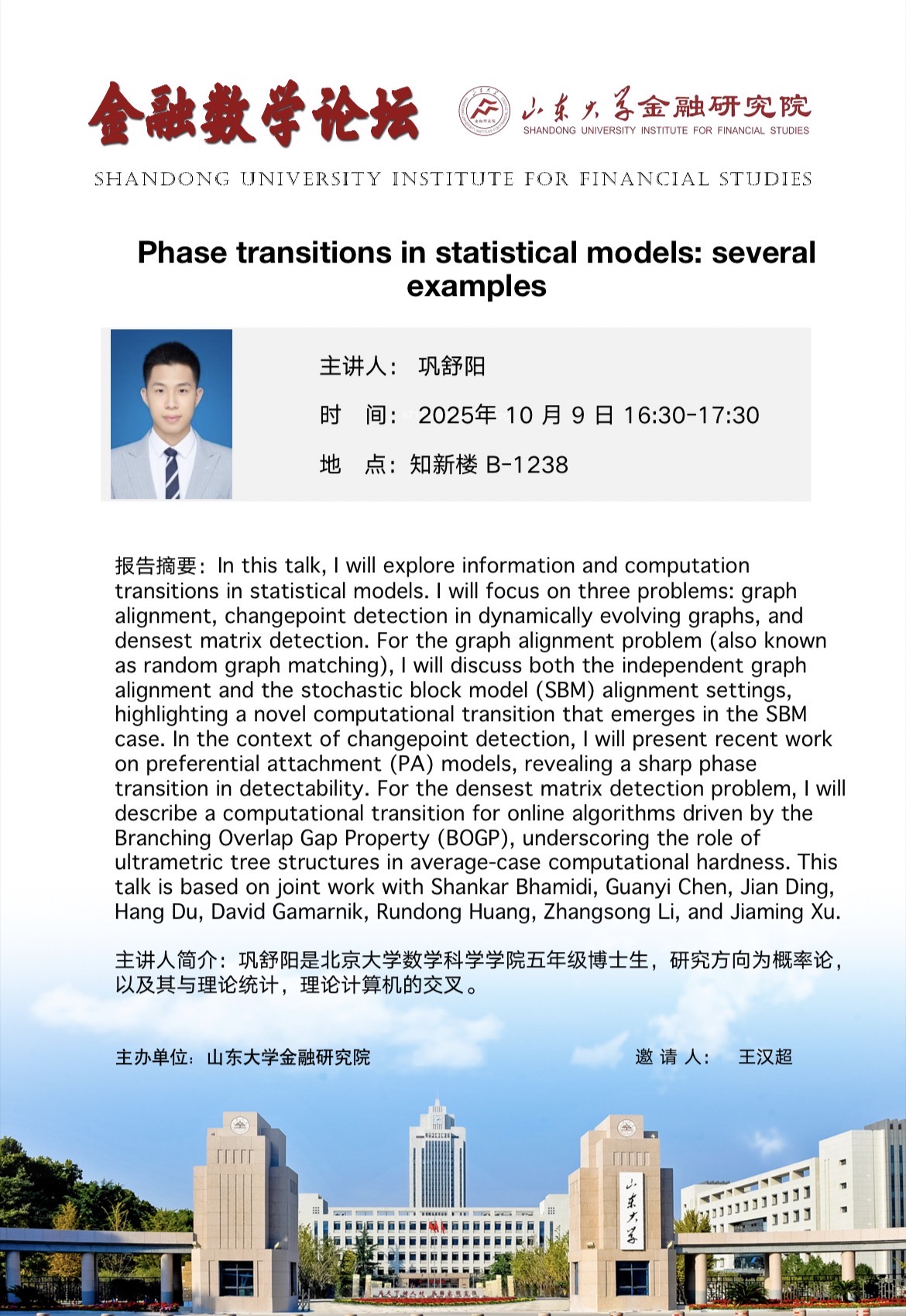 报告题目:Phase transitions in statistical models:several examples