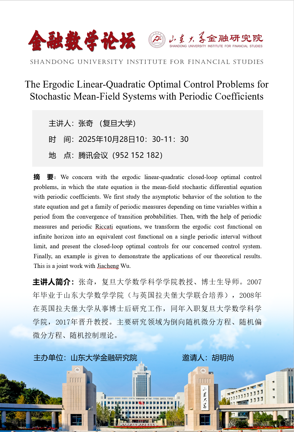 报告题目:The Ergodic Linear-Quadratic Optimal Control Problems for Stochastic Mean-Field Systems with Periodic Coefficients