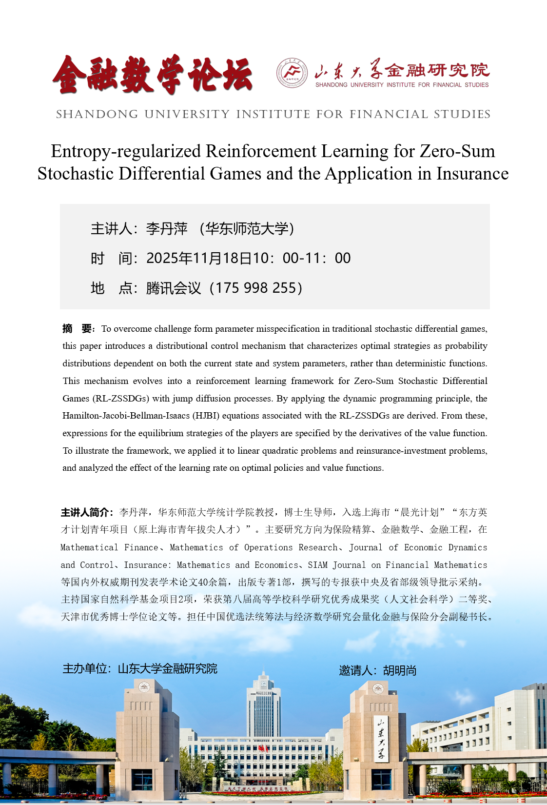 报告题目:Entropy-regularized Reinforcement Learning for Zero-Sum Stochastic Differential Games and the Application in Insurance