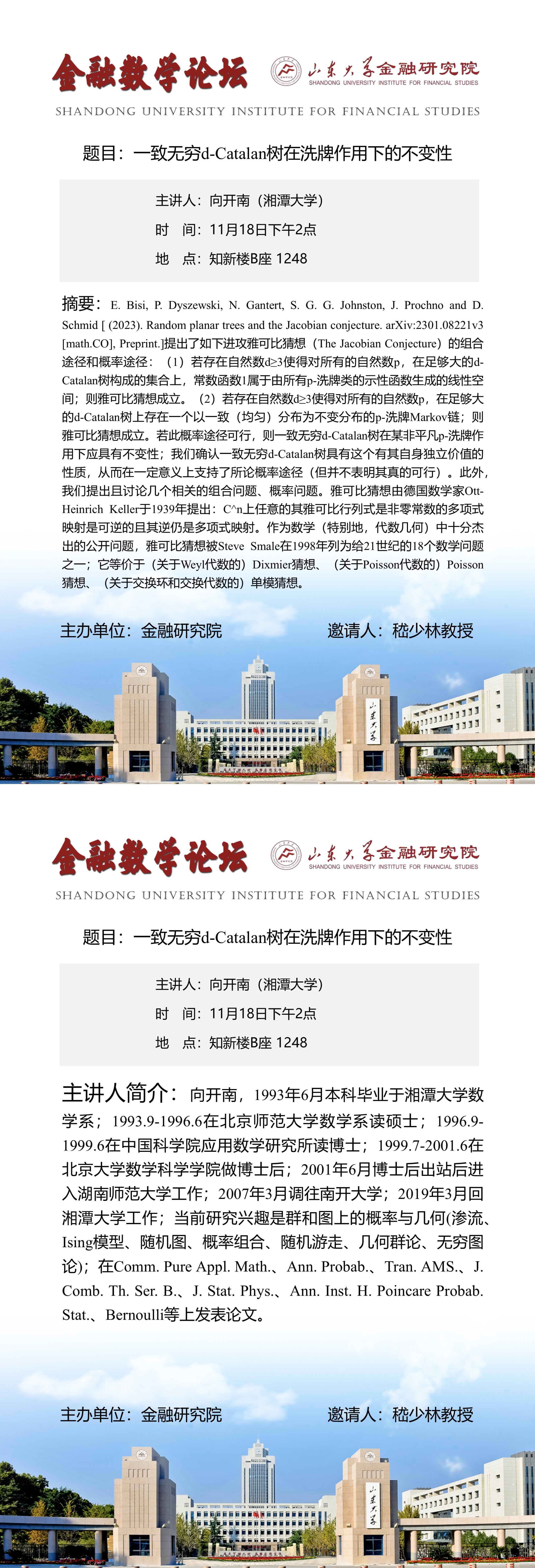 报告题目:一致无穷d-Catalan树在洗牌作用下的不变性
