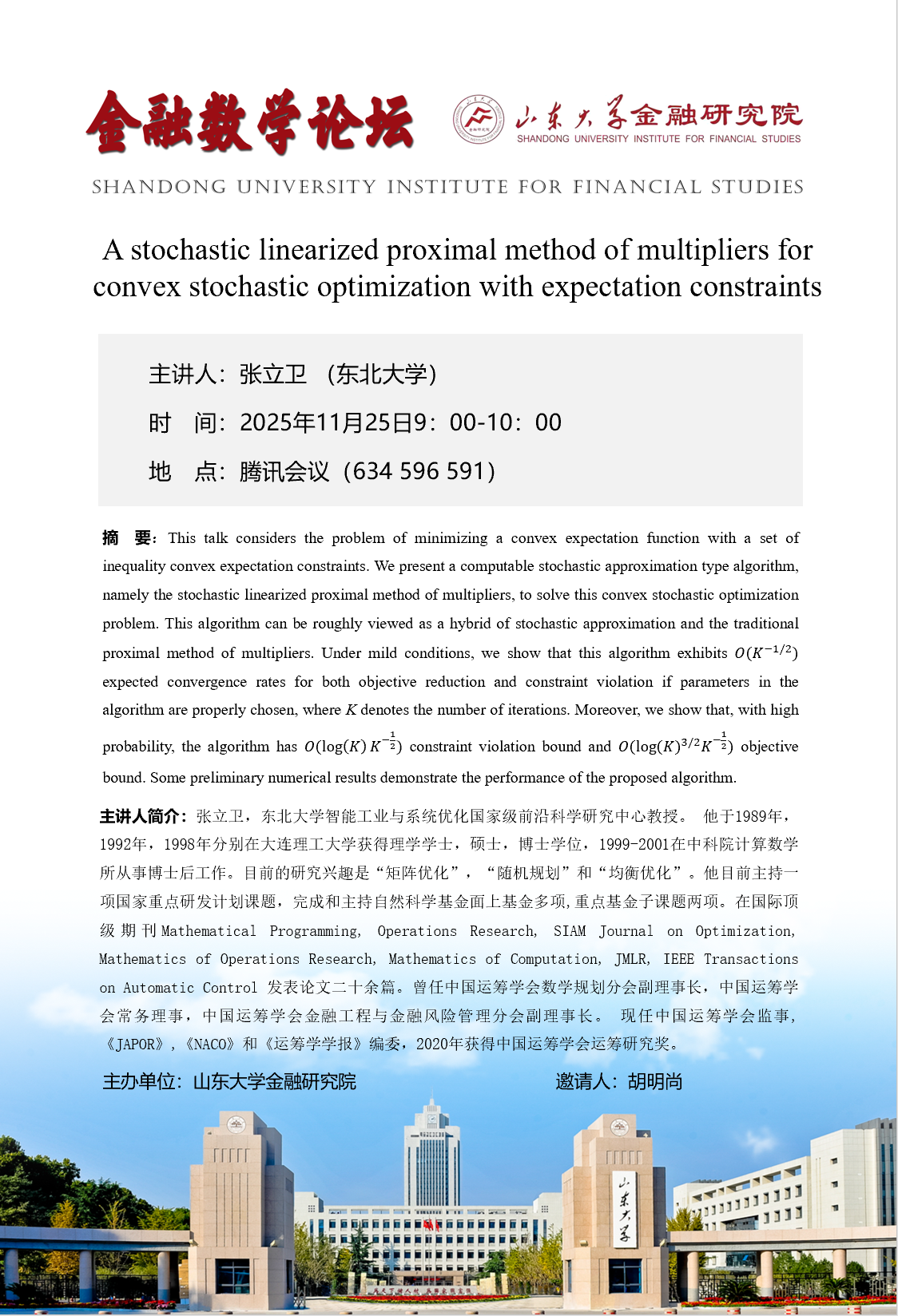 报告题目:A stochastic linearized proximal method of multipliers for convex stochastic optimization with expectation constraints