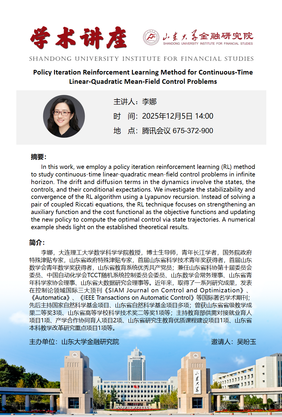 报告题目:Policy Iteration Reinforcement Learning Method for Continuous-Time Linear-Quadratic Mean-Field Control Problems