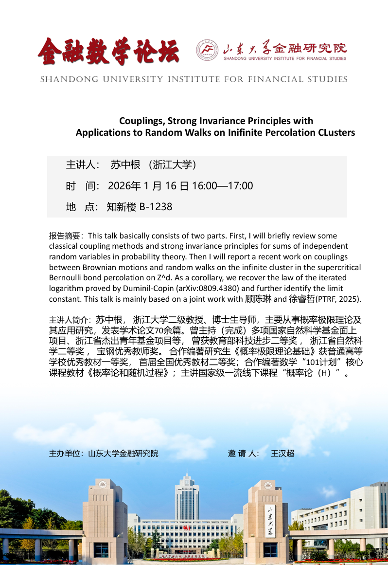 报告题目:Couplings, Strong Invariance Principles with Applications to Random Walks on Inifinite Percolation CLusters