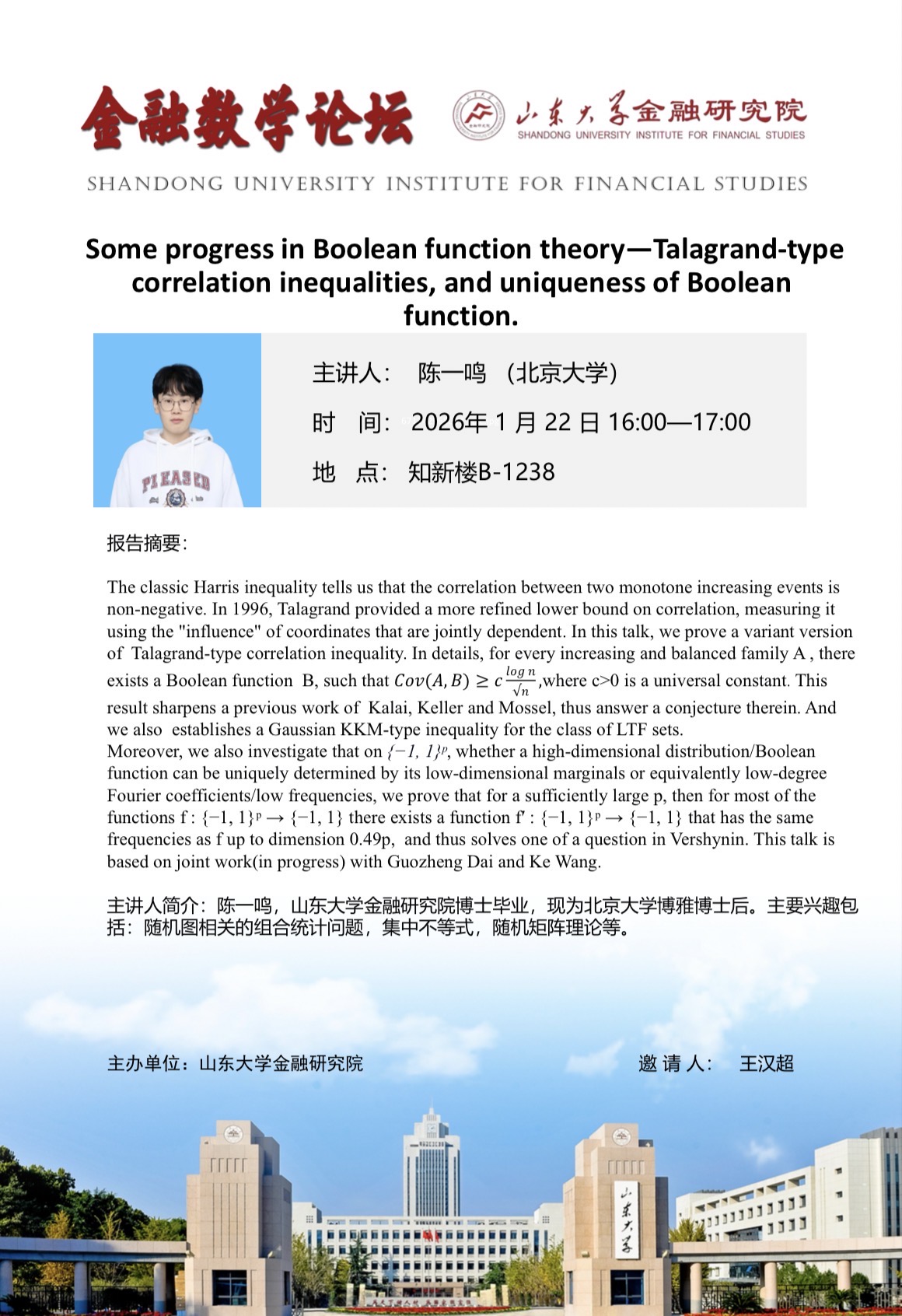 报告题目:Some progress in Boolean function theory-Talagrand-type correlation inequalities,and uniqueness of Boolean function.