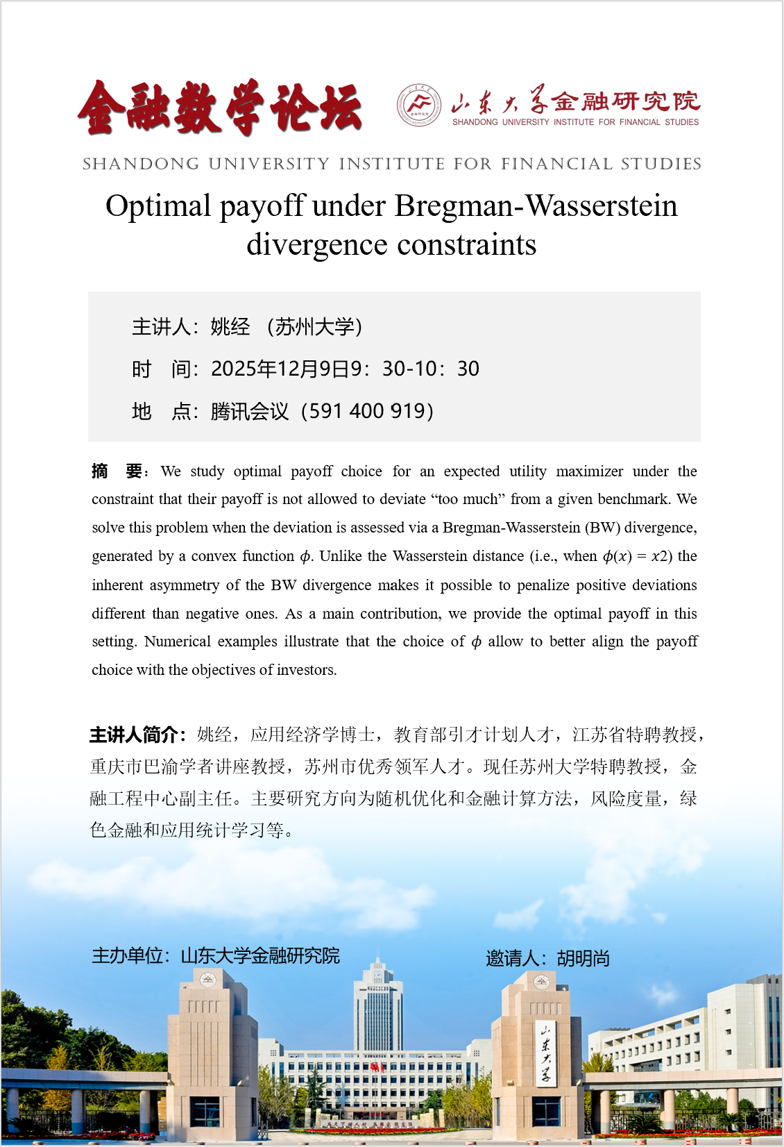 报告题目:Optimal payoff under Bregman-Wasserstein divergence constraints