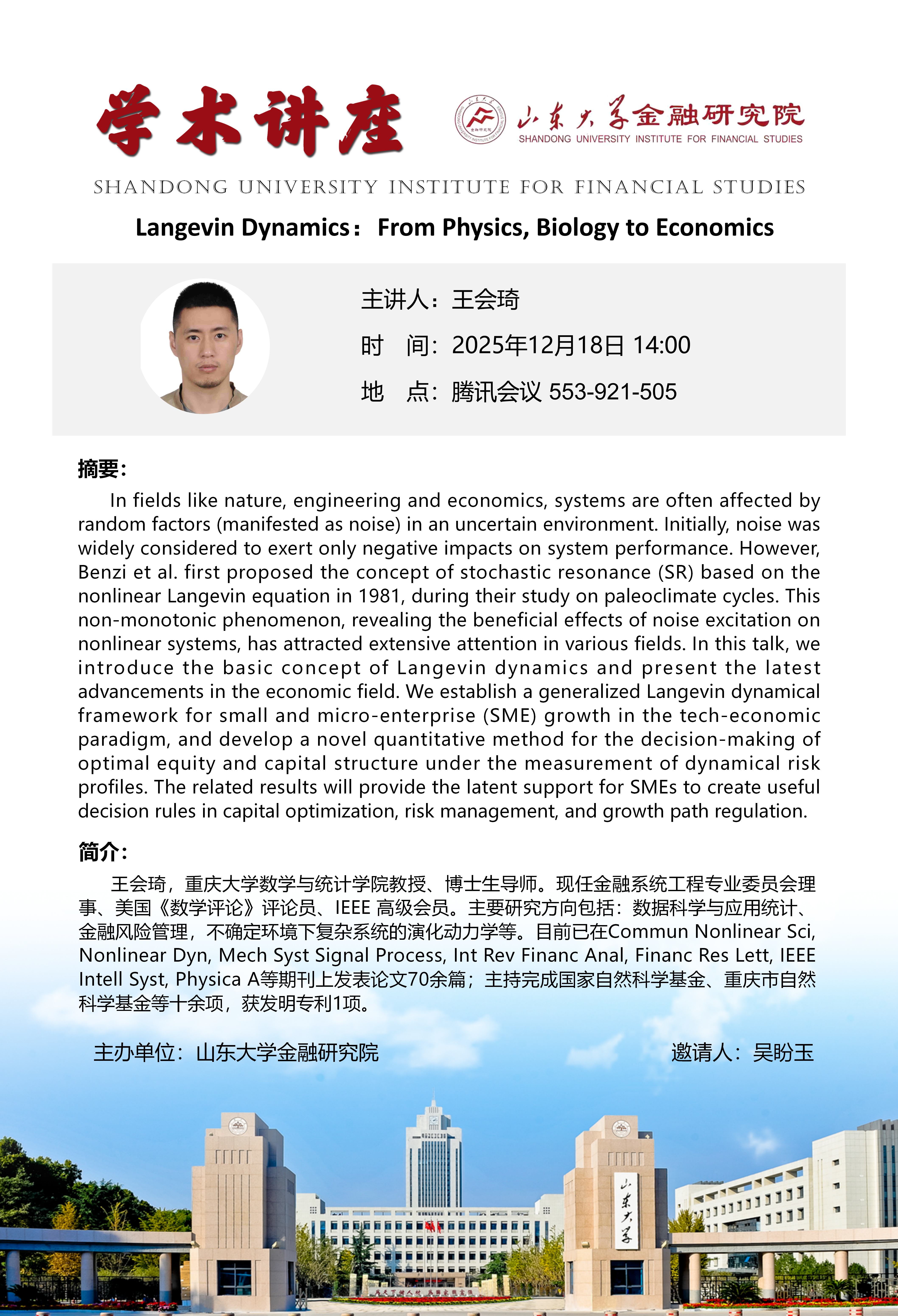 报告题目:Langevin Dynamics: From Physics, Biology to Economics